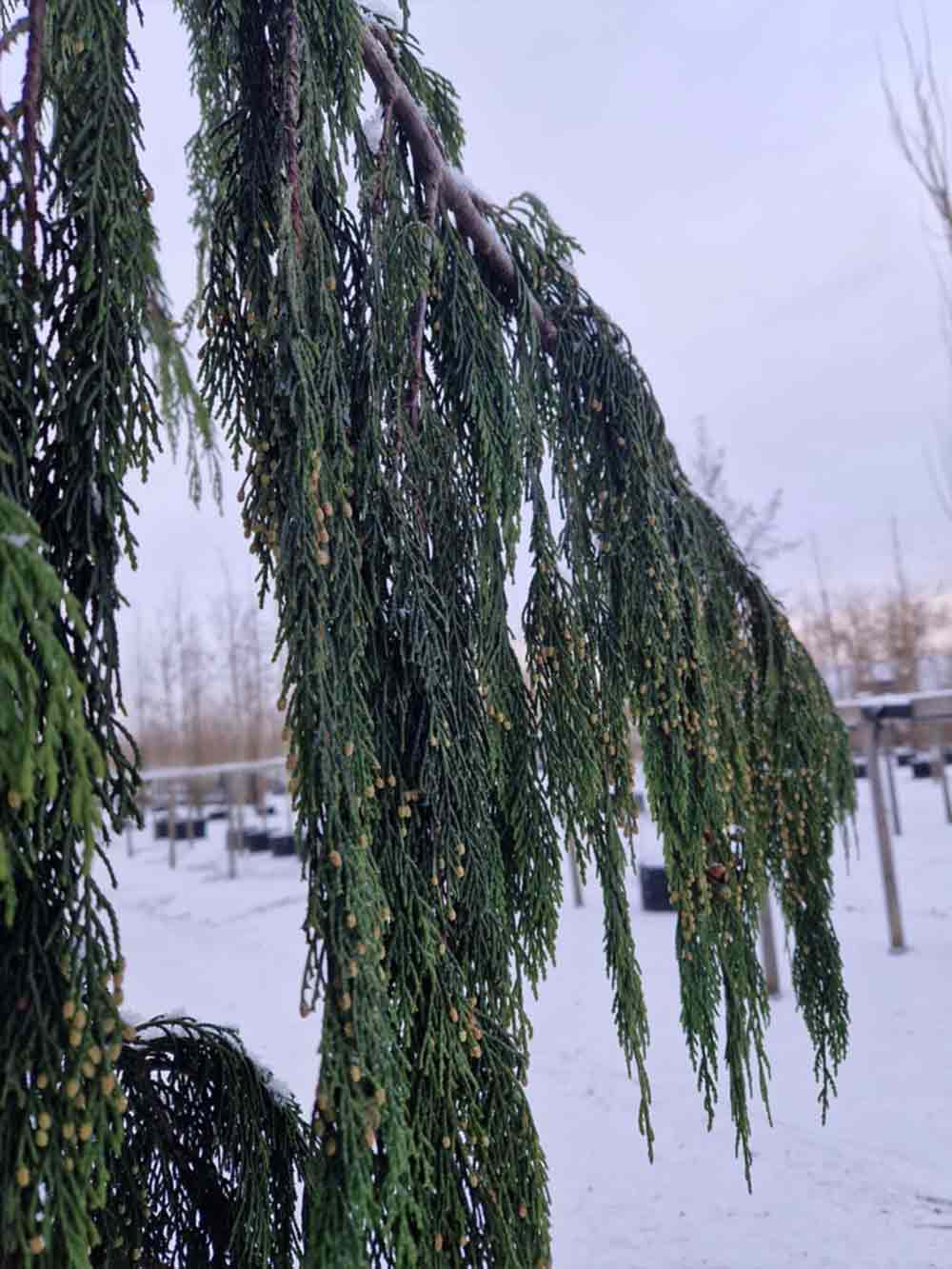 Typiskt för släktet är att toppen ofta nickar något till skillnad från tujorna där toppen är upprätt. Får till skillnad från tujorna runda, uppsprickande frukter utan fjäll.